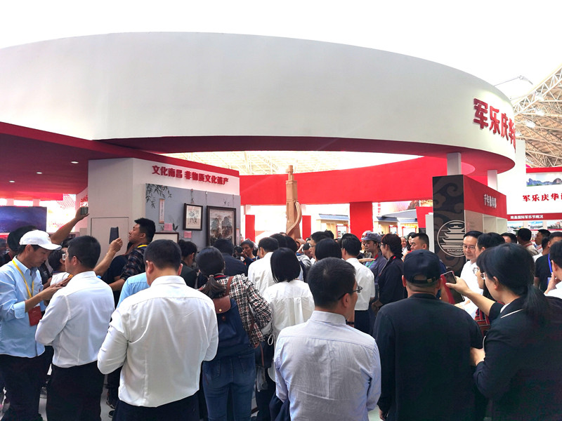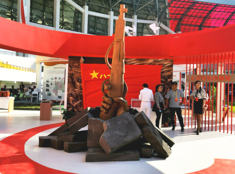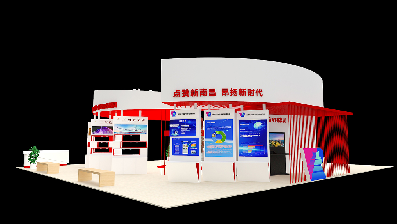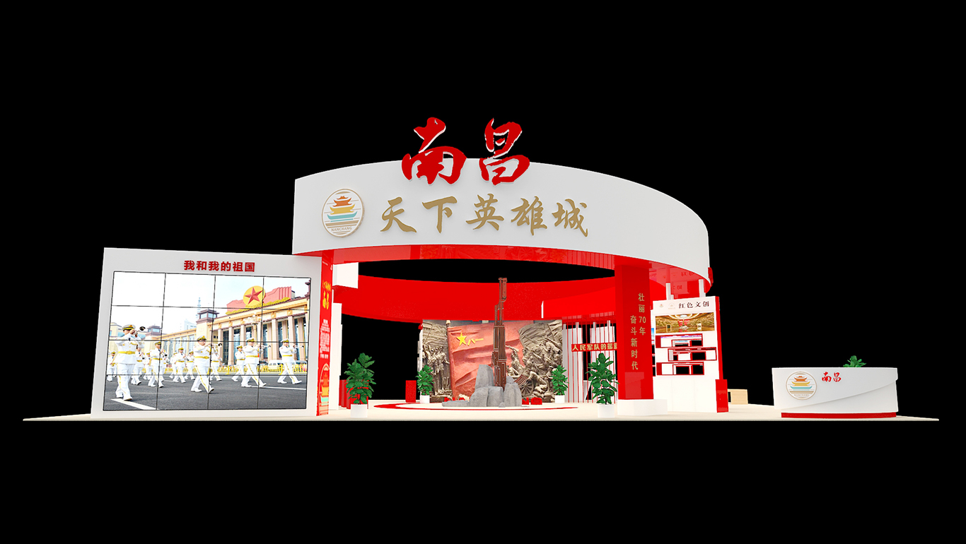 展臺總面積224平方,整個展臺是以南昌紅色文化為主導(dǎo)思想,采取不同的展板展示了八一館、新四軍舊址、滕王閣、南昌艦等的紅色文化景點及一些特色文創(chuàng)產(chǎn)品。南昌是人民軍隊的搖籃,是軍旗升起的地方,所以整個展臺以紅色調(diào)為主,更為突出這次展會的主題思想。